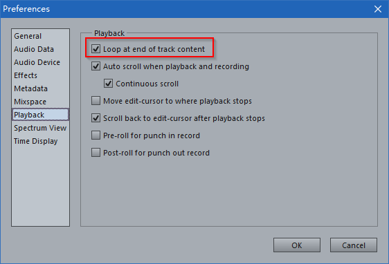 A new option added to loop at end of track content automatically when playing in mixspace.