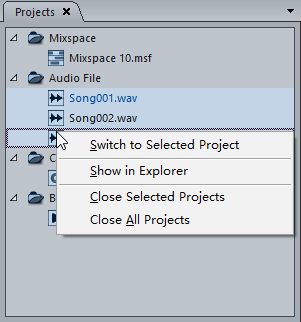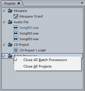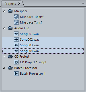 You may select audio file projects then use drag-drop to add files to mixspace, CD project and batch processor also.