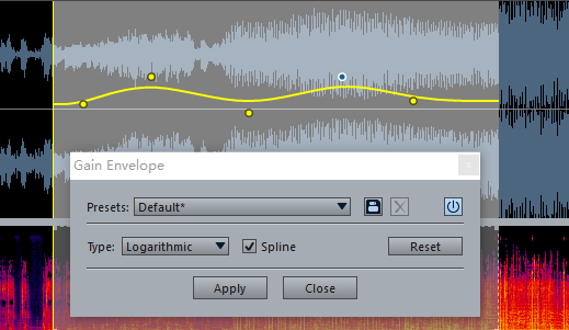 If spline mode is turned on when editing an automation envelope or gain envelope, envelope points will be used as control points to create a spline curve, and the controlled parameter will change smoothly following the curve.