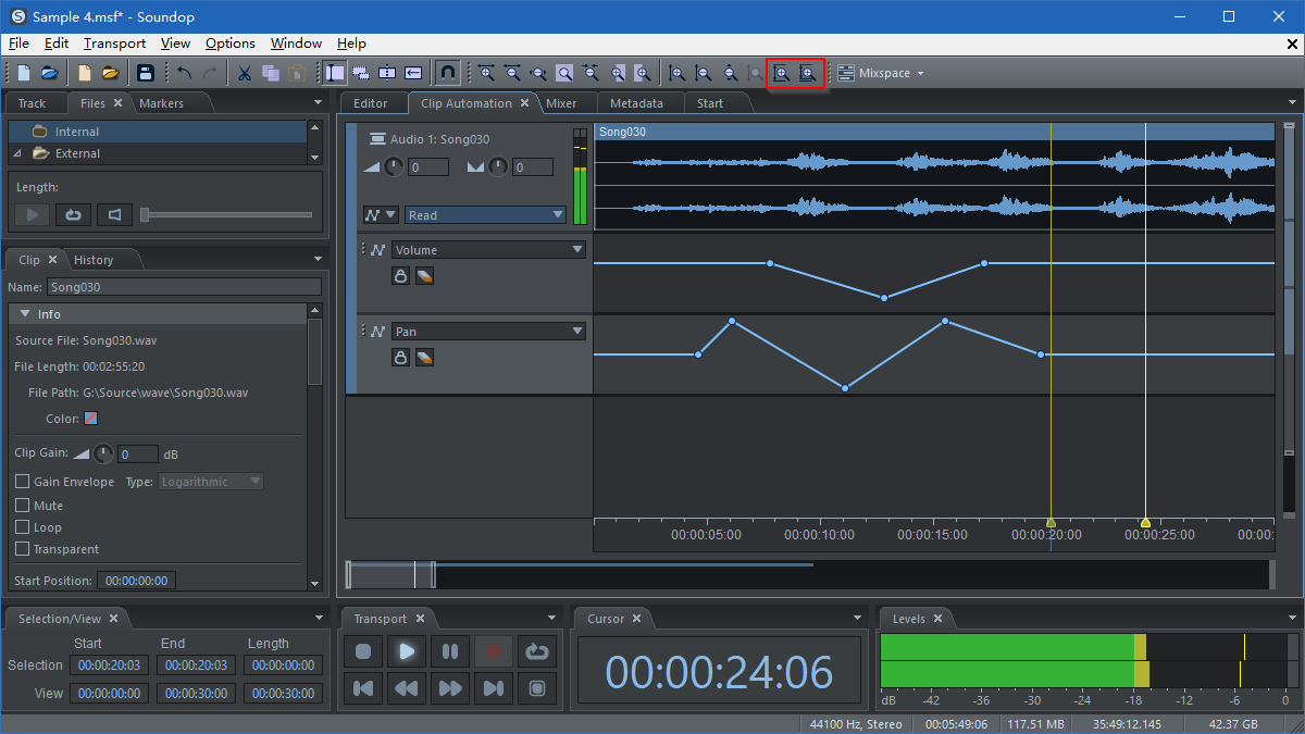 With the Zoom Selected Track and Zoom Selected Automation Lane command, the height of selected track or automation lane can be maximized to get a closer view, and the original height can be restored with the same command.